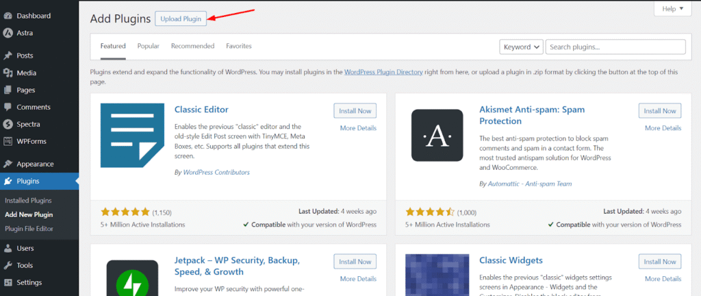 Go to Plugins > Add New: In the left sidebar of your dashboard, click on Plugins, then hit the Add New Plugin button at the top.